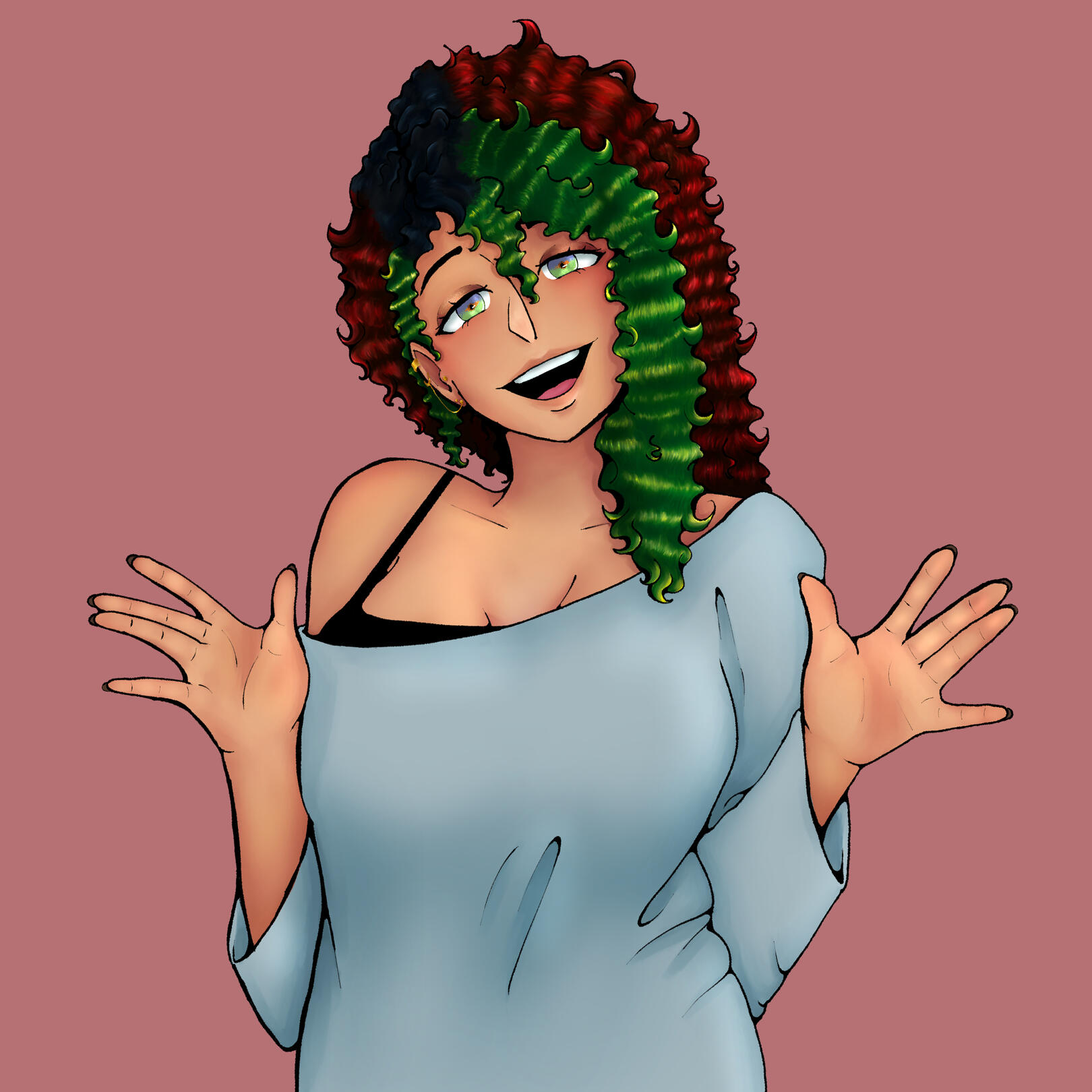 Appearance: Solita stands at 5'5"/165cm, weighing 210lbs/95kg. An olive-skinned woman, both chubby and muscular. Broad-shouldered, a soft stomach, wide hips, thick thighs, and large bust.Her hair is curly, cut in an asymmetric bob that’s grown out, and dyed auburn and green with black roots showing. Her hair colors have been compared to the colors of a kiwi, much to her dismay. Her hair is well-fried from many bleaching sessions and rounds of hair dye, so it's not as curly as it may have been naturally. It's incredibly soft, as Solita takes good care of her hair to make sure it isn't a dry and straw-like texture.Her eyes are hazel; blue-green with brown around her pupils, and are sleepy-looking. Sol has multiple piercings on her ears, two on her lobe, a helix, and a conch piercing on her right ear, while on her left she has three on her lobe, an industrial, and a daith. She's often wearing unusual earrings, which she often changes daily.Art of her will be under this tag. Here is an SFW reference for Solita + some of her outfits, and Here is an NSFW one.